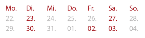 Di | Mi | Do | Fr 10:00 - 12:00 Uhr 15:00 - 18:00 Uhr Sa 11:00 - 13:00 Uhr